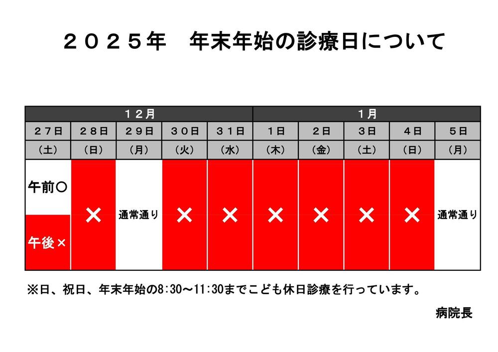最新情報 2025.12.05 年末年始の診療日について 年末年始の診療日についてお知らせいたします。 12/29(月)は通常通り診療を行います。 12/30(火)~1/4(日)まで休診。1/5(月)より通常診療となります。よろしくお願い致します。